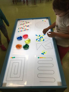 Malé děti mají v oblibě MALOVÁNÍ PRSTY. Modifikací této aktivity je POSOUVÁNÍ PŘEDMĚTŮ po různých plochách (po stole, po papíře, v gelovém pouzdře). Posouvání předmětů může být různě motivováno (např. přesouváme rybičky do pusy velké ryby, abychom ji nakrmili). Seskupováním předmětů můžeme tvořit obrazce nebo vzory (např. duhu, tvary písmen a číslic atd.).